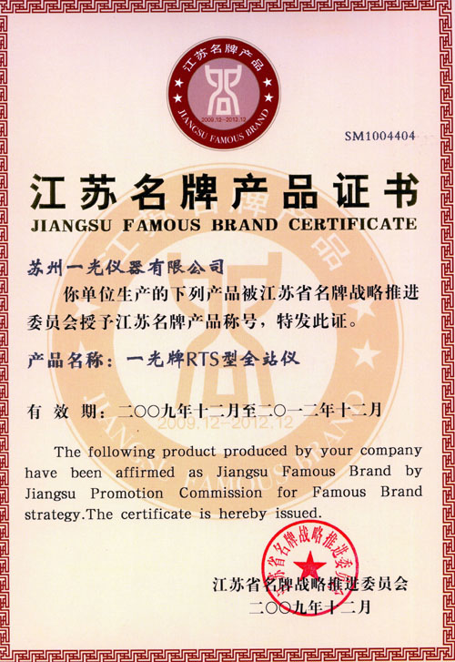 公司主導產品“一光牌RTS型全站儀”經江蘇名牌戰略推進委員會審核通過并向社會進行了公示,于近日被江蘇省經信委授予江蘇名牌產品證書。該產品質量在本省同類產品中處于領先地位,并達到國際、國內先進水平,有較高的市場占有率和品牌知名度。此次榮獲江蘇名牌產品證書,表明了蘇州一光技術創新、產品開發能力已居國內同行業前列。(蘇州一光提供)