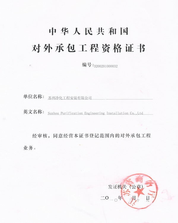 經江蘇省商務廳批準,蘇凈集團控股子公司——蘇州凈化工程安裝有限公司獲“中華人民共和國對外工程資格證書”。(蘇凈集團提供)